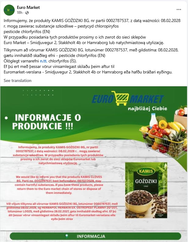 Þeir sem eiga umrædda vöru enn til eru beðnir um að neyta hennar ekki, farga eða skila henni í næstu Euromarket verslun, Smiðjuvegi 2, Hamraborg 9 eða Stakkholti 4b.
