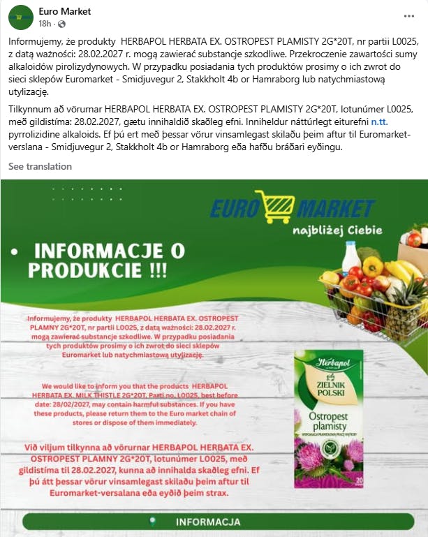 Innköllun á Ostropest plamisty herbatka ziołowa te vegna náttúrulegra eiturefna n.tt. pyrrolizidine alkaloids.